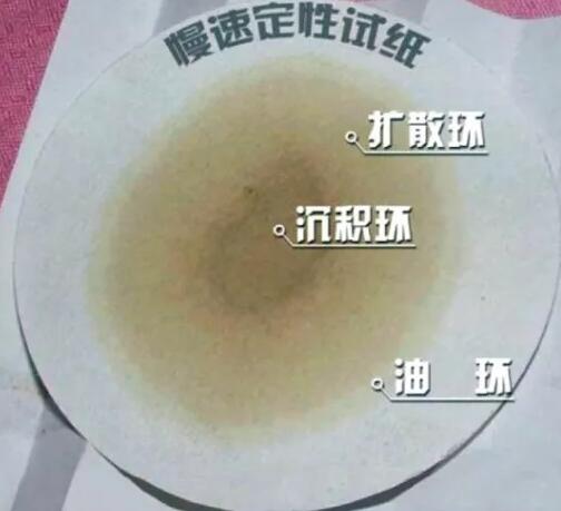 嚴(yán)格來說,在換機油之前需要對機油進(jìn)行檢測,主要檢測機油的總堿值、潤滑能力和黏度等指標(biāo),如果這些指標(biāo)都在合理的范圍內(nèi),則不必更換機油,否則就需要更換機油。但這種檢測需要很的設(shè)備,一般車主是不具備的。但有一些簡易的方法可以粗略地檢查機油的品質(zhì):首先準(zhǔn)備一張機油試紙,然后取出機油尺,往試紙上滴幾滴,然后靜待24h,形成的斑點(見下圖),沉積環(huán)在斑點中心,呈淡灰至黑色,為機油中的大顆粒不溶物沉積區(qū),機油接近報廢時,則清凈分散劑小時,沉積環(huán)直徑小,顏色黑,因此沉積環(huán)的顏色越深代表機油中的雜質(zhì)含量越高;擴散環(huán)在沉積環(huán)外圈呈淺灰色到灰色,是機油中的細(xì)小炭粒 (懸浮在機油中的細(xì)顆粒雜質(zhì)) 隨清凈分散劑向外擴散留下的痕跡,顆粒越細(xì),擴散的越遠(yuǎn),它表示油內(nèi)添加劑對污染雜質(zhì)的分散能力,擴散環(huán)越寬,表明機油的分散性越好,機油的剩余壽命越長,擴散環(huán)越窄,表明機油分散性差或添加劑已耗盡;油環(huán)在擴散環(huán)的外圈,呈淡黃到棕紅色的浸油區(qū),代表的是機油的氧化程度,新機油的油環(huán)透明,廢油的油環(huán)顏色由黃色變成棕紅的。一般來說,油環(huán)、擴散環(huán)、沉積環(huán)的界限越模糊越好。