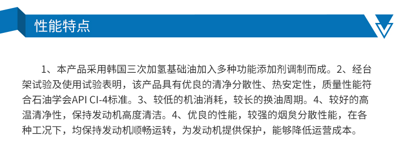 ●本產(chǎn)品采用韓國(guó)三次加氫基礎(chǔ)油加入多種功能添加劑調(diào)制而成。 ●經(jīng)臺(tái)架試驗(yàn)及使用試驗(yàn)表明,該產(chǎn)品具有優(yōu)良的清凈分散性、熱安定性及抗氧性,質(zhì)量性能符合石油學(xué)會(huì)API CH-4標(biāo)準(zhǔn)。 ●較低的機(jī)油消耗,更長(zhǎng)的換油周期。 ●較好的高溫清凈性,保持發(fā)動(dòng)機(jī)高度清潔。 ●優(yōu)異的抗氧、抗腐抗磨性能,煙炱分散性能,在各種工況下,均保持發(fā)動(dòng)機(jī)順暢運(yùn)轉(zhuǎn),為發(fā)動(dòng)機(jī)提供保護(hù),顯著降低運(yùn)營(yíng)成本。
