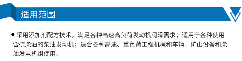 ●采用添加劑配方技術(shù),滿足各種高速高負(fù)荷四沖程發(fā)動(dòng)機(jī)潤(rùn)滑需求;適用于各種使用含硫柴油的柴油發(fā)動(dòng)機(jī);適合各種高速、重負(fù)荷工程機(jī)械和車輛、礦山設(shè)備和柴油發(fā)電機(jī)組使用。